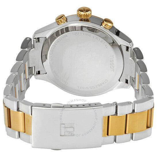 Stainless steel case with a two-tone (silver-tone and yellow gold PVD) stainless steel bracelet. Fixed yellow gold PVD bezel. Blue dial with luminous gold-tone hands and index hour markers. Minute markers around the outer rim. Dial Type: Analog. Luminescent hands and markers. Date display at the 4 o'clock position. Chronograph - three sub-dials displaying: 60 second, 30 minute and 1/10th of a second. ETA caliber G10.212 quartz movement. Scratch resistant sapphire crystal. Solid case back. Round case shape. Case size: 45 mm. Case thickness: 11 mm. Band width: 22 mm. Fold over clasp with a safety release. Water resistant at 100 meters / 330 feet. Functions: chronograph, rattrapante, date, hour, minute, small second. T-sport Series. Sport watch style. Watch label: Swiss Made. Tissot T-Sport Chronograph Quartz Blue Dial Men's Watch T116.617.22.041.00.