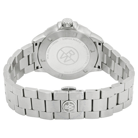 Stainless steel case with a stainless steel bracelet. Uni-directional rotating stainless steel bezel with a green aluminum (count-up elapsed time) ring. Black dial with luminous silver-tone hands and index hour markers. Minute markers around the outer rim. Dial Type: Analog. Luminescent hands and markers. Date display at the 3 o'clock position. ETA caliber F06.111 quartz movement. Scratch resistant sapphire crystal. Screw down crown. Solid case back. Round case shape. Case size: 42 mm. Case thickness: 10 mm. Band width: 20 mm. Fold over clasp with a push button release. Water resistant at 300 meters / 1000 feet. Functions: date, hour, minute, second. Tango Series. Dive watch style. Watch label: Swiss Made. Raymond Weil Tango Black Dial Men's Watch 8260-ST7-20001.