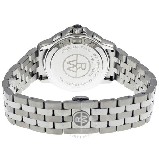 Stainless steel case with a stainless steel bracelet. Fixed stainless steel bezel. Black roman numeral, chronograph dial with silver-toned hands and Roman numeral hour markers. Minute markers around the outer rim. Dial Type: Analog. Date display at the 12 o'clock position. Chronograph - three sub-dials displaying: 60 second, 30 minute and 1/10th of a second. Quartz movement. Scratch resistant sapphire crystal. Solid case back. Case diameter: 40 mm. Round case shape. Tang clasp. Water resistant at 100 meters / 330 feet. Functions: chronograph, date, hour, minute, second. Casual watch style. Watch label: Swiss Made. Raymond Weil Tango Black Dial Stainless Steel Men's Watch 4891-ST-00200.