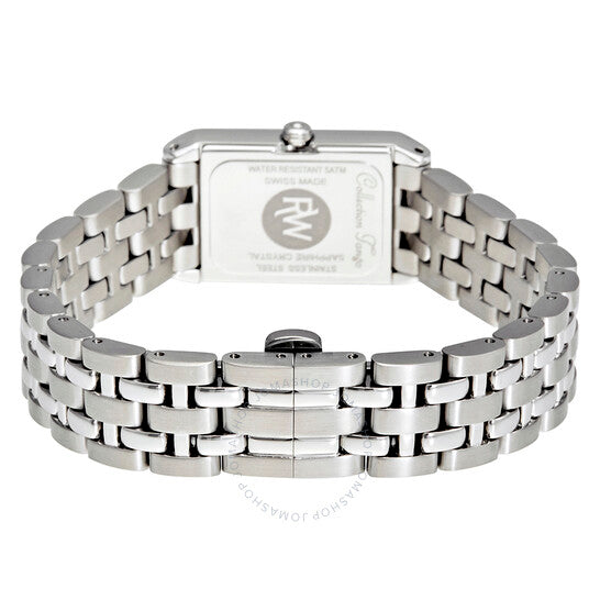 Stainless steel case with a stainless steel bracelet. Fixed stainless steel bezel set with diamonds. Mother of pearl dial with luminous silver-tone hands and diamond hour markers. Roman numerals mark the 3, 6, 9 and 12 o'clock positions. Dial Type: Analog. Luminescent hands. Quartz movement. Scratch resistant sapphire crystal. Pull / push crown. Solid case back. Case dimensions: 18 mm x 23.5 mm. Case thickness: 7 mm. Rectangle case shape. Band width: 14 mm. Deployment clasp with a push button release. Water resistant at 30 meters / 100 feet. Functions: hour, minute. Dress watch style. Watch label: Swiss Made. Raymond Weil Tango Mother of Pearl Stainless Steel Ladies Watch 5971-STS-00995.