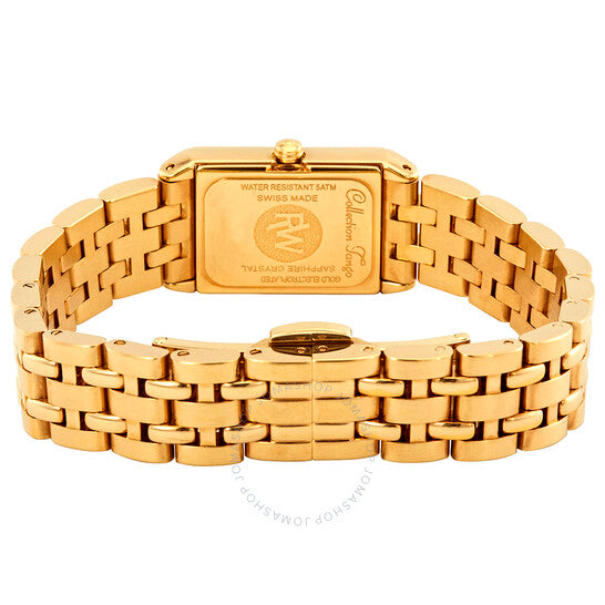 Yellow gold-tone stainless steel case and bracelet. Fixed yellow gold-tone bezel. Mother of pearl dial with yellow gold-tone hands and dot hour markers. Roman numerals amrk the 3, 6, 9 and 12 o'clock positions. Dial Type: Analog. Quartz movement. Scratch resistant sapphire crystal. Pull / push crown. Solid case back. Case dimensions: 30 mm x 18 mm. Case thickness: 6.75 mm. Rectangle case shape. Band width: 13 mm. Deployment clasp. Water resistant at 50 meters / 165 feet. Functions: hour, minute. Additional Info: suitable for swimming and showering. Dress watch style. Watch label: Swiss Made. Item Variations: 5971 P 00915, 5971.P.00915, 5971P00915. Raymond Weil Tango Mother of Pearl Dial Ladies Watch 5971-P-00915.