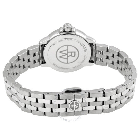 Stainless steel case with a stainless steel bracelet. Fixed stainless steel bezel. Blue dial with luminous silver-tone hands and Roman numeral hour markers. Minute markers around the outer rim. Dial Type: Analog. Luminescent hands. Date display at the 3 o'clock position. Quartz movement. Scratch resistant sapphire crystal. Screw down crown. Solid case back. Round case shape. Case size: 30 mm. Case thickness: 7.35 mm. Fold over clasp with a safety release. Water resistant at 100 meters / 330 feet. Functions: date, hour, minute, second. Tango Series. Dress watch style. Watch label: Swiss Made. Raymond Weil Tango Quartz Blue Dial Ladies Watch 5960-ST-00500.