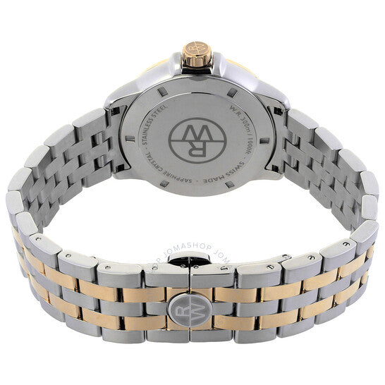Silver-tone stainless steel case with a two-tone (silver-tone and gold-tone) stainless steel bracelet. Fixed gold-tone stainless steel bezel. Blue dial with gold-tone hands and index hour markers. Minute markers around the outer rim. Dial Type: Analog. Luminescent hands and markers. Date display at the 3 o'clock position. Quartz movement. Scratch resistant sapphire crystal. Screw down crown. Solid case back. Round case shape, case size: 41 mm, case thickness: 10.05 mm. Band width: 20 mm. Fold over clasp with a safety release. Water resistant at 300 meters / 1000 feet. Functions: date, hour, minute, second. Tango Series. Casual watch style. Watch label: Swiss Made. Raymond Weil Tango Quartz Blue Dial Men's Watch 8160-STP-50041.