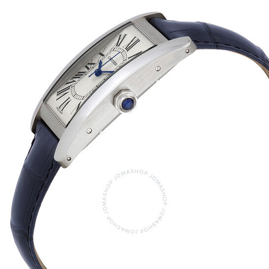 Stainless steel case with a navy blue (alligator) leather strap. Fixed stainless steel bezel. Silver dial with blue hands and Roman numeral hour markers. Minute markers around an inner ring. Dial Type: Analog. Automatic movement. Scratch resistant sapphire crystal. Pull / push crown set with a synthetic cabochon-shaped spinel. Solid case back. Case dimensions: 45.10 mm x 26.60 mm. Case thickness: 9.65 mm. Rectangle case shape. Band width: 14 mm. Deployment clasp. Water resistant at 30 meters / 100 feet. Functions: hour, minute, second. Additional Info: crown set with a synthetic blue spinel. Luxury watch style. Watch label: Swiss Made. Cartier Tank Americaine Automatic Silver Dial Men's Watch WSTA0018.