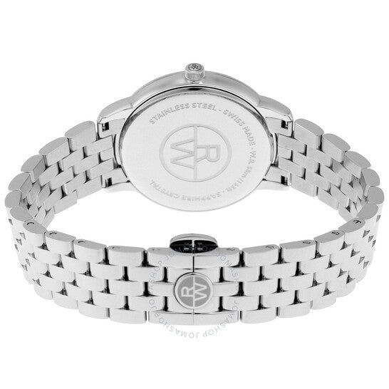 Stainless steel case with a stainless steel bracelet. Fixed stainless steel set with diamonds bezel. Black dial with silver-tone hands and diamond hour markers. Minute markers around the outer rim. Dial Type: Analog. Date display at the 3 o'clock position. Quartz movement. Scratch resistant sapphire crystal. Solid case back. Case diameter: 34 mm. Round case shape. Deployment clasp. Water resistant at 50 meters / 165 feet. Functions: date, hour, minute. Dress watch style. Watch label: Swiss Made. Raymond Weil Tocatta Black Dial Stainless Steel Ladies Watch 5388-STS-20081.