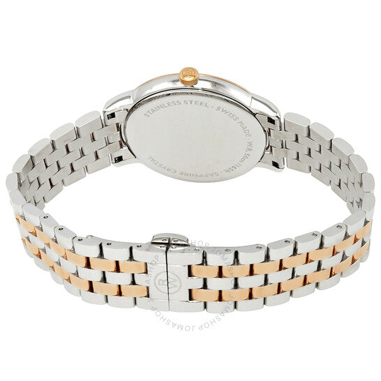 Stainless steel case with a two-tone (stainless steel with rose gold PVD plated) stainless steel bracelet. Fixed rose gold PVD bezel. Black dial with rose gold-tone hands and index hour markers. Minute markers around the outer rim. Dial Type: Analog. Date display at the 3 o'clock position. Quartz movement. Scratch resistant sapphire crystal. Pull / push crown. Solid case back. Round case shape. Case size: 39 mm. Case thickness: 7.82 mm. Fold over clasp with a safety release. Water resistant at 50 meters / 165 feet. Functions: date, hour, minute. Dress watch style. Watch label: Swiss Made. Raymond Weil Toccata Classic Quartz Black Dial Men's Watch 5485-SP5-20001.