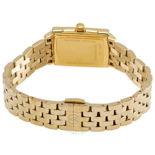 Yellow gold PVD stainless steel case and bracelet. Fixed yellow gold PVD stainless steel bezel. Mother of pearl dial with yellow gold-tone hands and diamond hour markers. Roman numerals appear at the 6, 9 and 12 o'clock positions. Minute markers around the outer rim. Dial Type: Analog. Date display at the 3 o'clock position. Quartz movement. Scratch resistant sapphire crystal. Screw down crown. Solid case back. Rectangle case shape, case size: 22.6 mm x 28.1 mm, case thickness: 6.25 mm. Fold over clasp. Water resistant at 50 meters / 165 feet. Functions: date, hour, minute, second. Toccata Series. Dress watch style. Watch label: Swiss Made. Raymond Weil Toccata Quartz Diamond Ladies Watch 5925-P-00995.