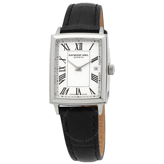 Stainless steel case with a black (alligator) leather strap. Fixed stainless steel bezel. White dial with silver-tone hands and Roman numeral hour markers. Minute markers around the outer rim. Dial Type: Analog. Date display at the 3 o'clock position. Quartz movement. Scratch resistant sapphire crystal. Pull / push crown. Solid case back. Rectangle case shape. Case dimensions: 22.6 mm x 28.1 mm. Case thickness: 6.26 mm. Tang clasp. Water resistant at 50 meters / 165 feet. Functions: date, hour, minute. Dress watch style. Watch label: Swiss Made. Raymond Weil Quartz White Dial Ladies Watch 5925 -STC-00300.