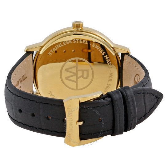 Yellow gold PVD stainless steel case with a black leather strap. Fixed yellow gold PVD bezel. White dial with yellow gold-tone hands and Roman numeral hour markers. Minute markers around the outer rim. Dial Type: Analog. Date display at the 3 o'clock position. Quartz movement. Scratch resistant sapphire crystal. Pull / push crown. Solid case back. Case size: 42 mm. Case thickness: 9 mm. Round case shape. Band width: 18 mm. Tang clasp. Water resistant at 50 meters / 165 feet. Functions: hour, minute. Dress watch style. Watch label: Swiss Made. Item Variations: 5588 PC 00300, 5588.PC.00300, 5588PC00300. Raymond Weil Toccata White Dial Men's Watch 5588-PC-00300.