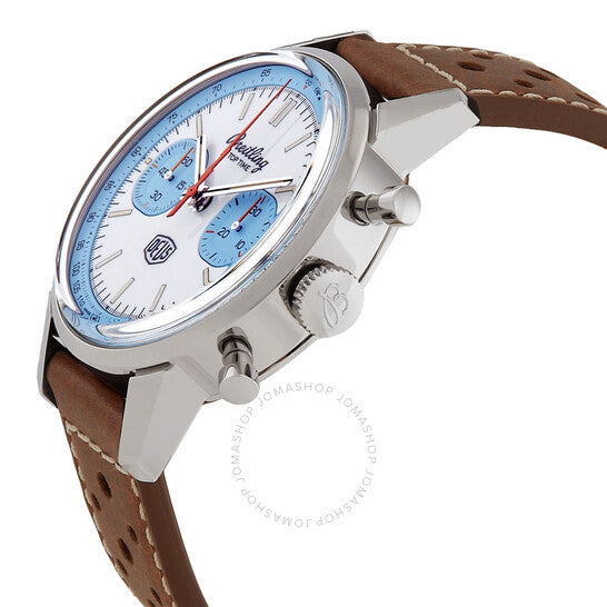 Silver-tone stainless steel case with a brown leather strap. Fixed silver-tone stainless steel bezel. White dial with silver-tone hands and index hour markers. Minute markers around the outer rim. Dial Type: Analog. Luminescent hands and markers. Chronograph - two sub-dials displaying: 60 second and 30 minute. Breitling Calibre 23 Automatic movement, based upon ETA 7753, containing 27 Jewels, bitting at 28800 vph, and has a power reserve of approximately 42 hours. Scratch resistant sapphire crystal. Pull / push crown. Solid case back. Round case shape, case size: 41 mm. Fold over clasp with a safety release. Water resistant at 30 meters / 100 feet. Functions: chronograph, hour, minute, second. Top Time Series. Casual watch style. Watch label: Swiss Made. Breitling Top Time Chronograph Automatic White Dial Men's Watch A233112A1A1X1.