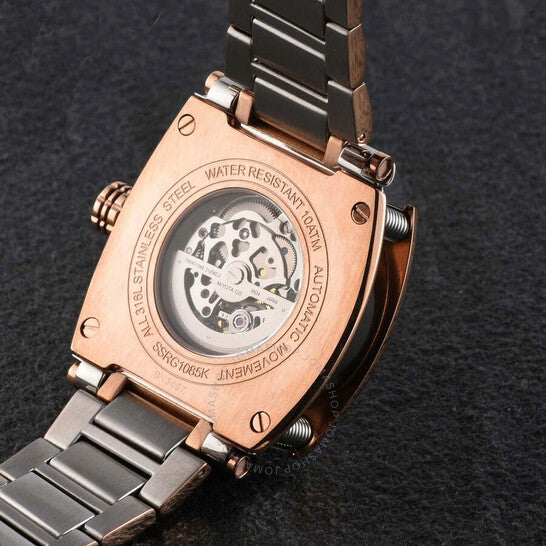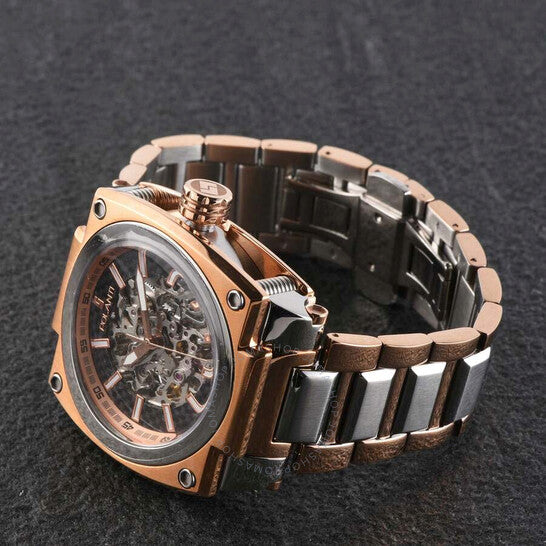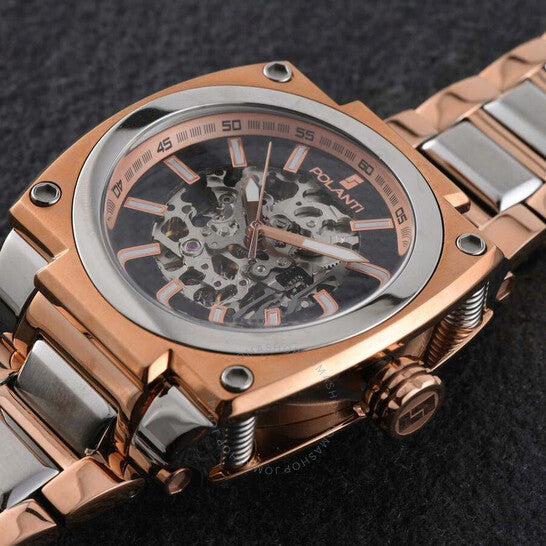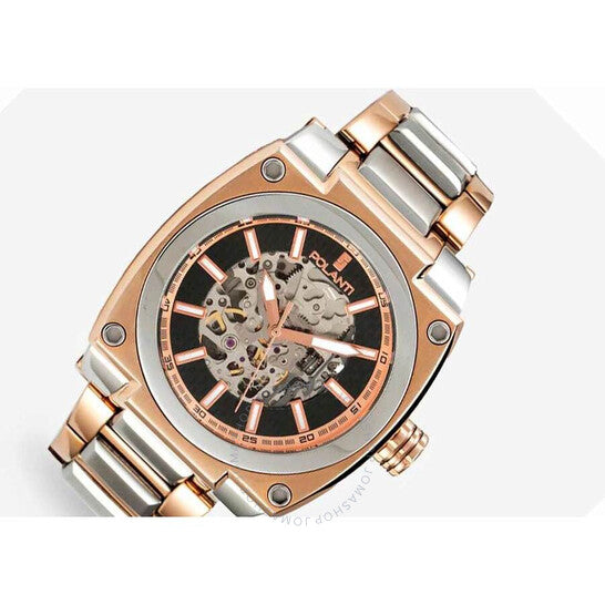 Polanti - Torque II, Miyota Automatic Skeletal Movement, Black Dial,Black-IP band, 2-tone case and band Two-tone stainless steel case with a rose gold-tone stainless steel bracelet. Fixed rose gold-tone stainless steel bezel. Black dial with rose gold-tone hands and index hour markers. Minute markers around the outer rim. Dial Type: Analog. Luminescent hands and markers. Automatic movement. Scratch resistant sapphire crystal. Screw down crown. Transparent case back. Round case shape, case size: 45 mm, case thickness: 14 mm. Band width: 26 mm, band length: 7.5 inches. Deployment with push button release clasp. Water resistant at 100 meters / 330 feet. Functions: hour, minute, second. Torque II Auto Series. Casual watch style. Watch label: Japan Movt. Polanti Torque Ii Auto Black Dial Men's Watch PLT2001-SVRG.