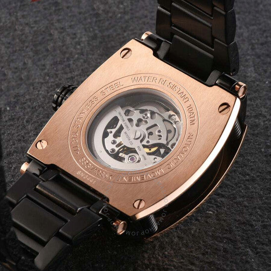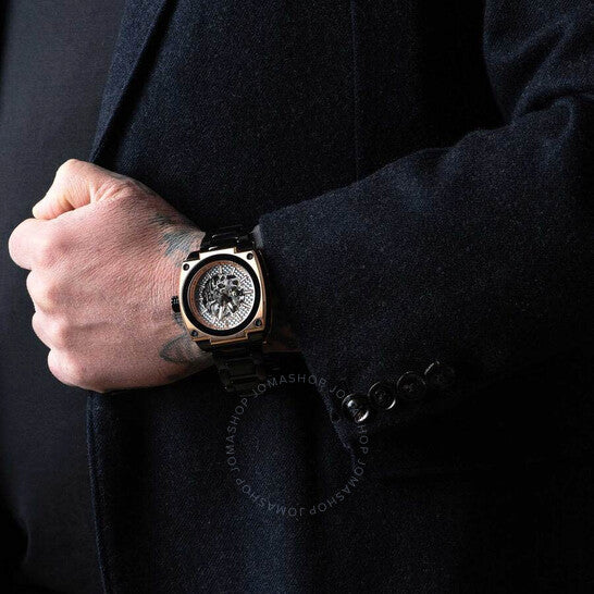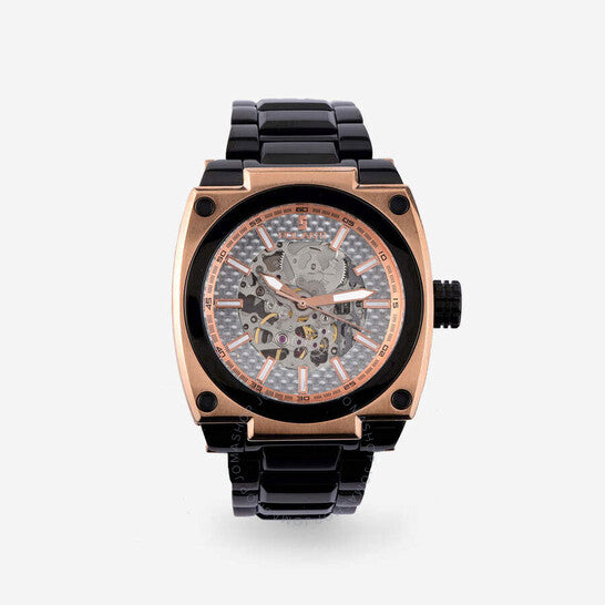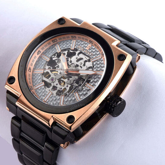 Polanti - Torque II, Miyota Automatic Skeletal Movement, Black Dial,2-tone Rose -Silver tone case and band Two-tone stainless steel case with a black stainless steel bracelet. Fixed black stainless steel bezel. Silver-tone dial with rose gold-tone hands and index hour markers. Minute markers around the outer rim. Dial Type: Analog. Luminescent hands and markers. Automatic movement. Scratch resistant sapphire crystal. Screw down crown. Transparent case back. Round case shape, case size: 45 mm, case thickness: 14 mm. Band width: 26 mm, band length: 7.5 inches. Deployment with push button release clasp. Water resistant at 100 meters / 330 feet. Functions: hour, minute, second. Torque II Auto Series. Casual watch style. Watch label: Japan Movt. Polanti Torque Ii Auto Silver-tone Dial Men's Watch PLT2001-RGBK.