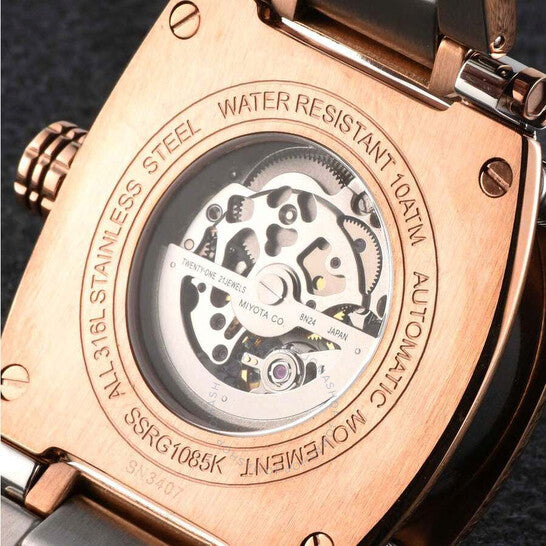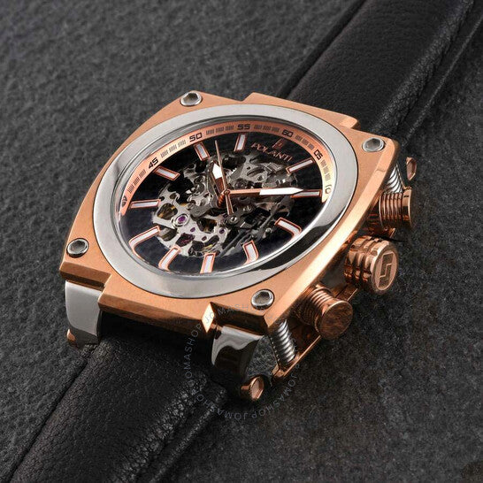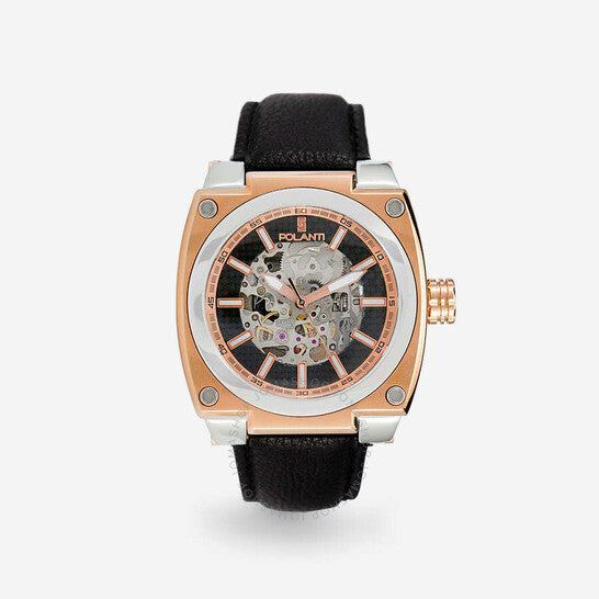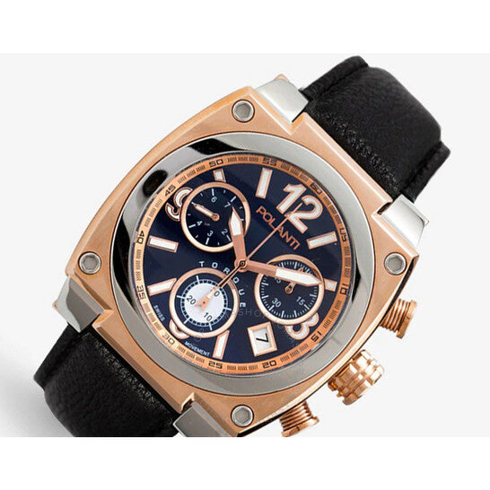 Polanti - Torque II, Miyota Automatic Skeletal Movement, White Dial,Black Genuine Leather band Rose gold-tone stainless steel case with a black genuine leather strap. Fixed silver-tone stainless steel bezel. White dial with rose gold-tone hands and index hour markers. Minute markers around the outer rim. Dial Type: Analog. Luminescent hands and markers. Date display at the 4 o'clock position. Automatic movement. Scratch resistant sapphire crystal. Pull / push crown. Transparent case back. Round case shape, case size: 45 mm, case thickness: 14 mm. Band width: 26 mm, band length: 7.5 inches. Buckle clasp. Water resistant at 100 meters / 330 feet. Functions: chronograph, date, hour, minute, second. Torque II Auto Series. Casual watch style. Watch label: Japan Movt. Polanti Torque Ii Auto White Dial Men's Watch PLT2002LB-RG.
