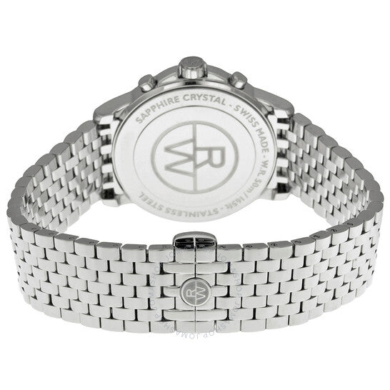 Stainless steel case with a stainless steel bracelet. Fixed stainless steel bezel. Silver dial with blue hands and Roman numeral hour markers. Minute markers around the outer rim. Dial Type: Analog. Date display below the 12 o'clock position. Chronograph - three sub-dials displaying: 60 second, 30 minute and 1/10th of a second. Quartz movement. Scratch resistant sapphire crystal. Pull / push crown. Solid case back. Case diameter: 39 mm. Case thickness: 9.25 mm. Round case shape. Deployment clasp. Water resistant at 50 meters / 165 feet. Functions: chronograph, date, hour, minute, second. Dress watch style. Watch label: Swiss Made. Raymond Weil Tradition Chronograph Silver Dial Stainless Steel Men's Watch 4476-ST-00650.
