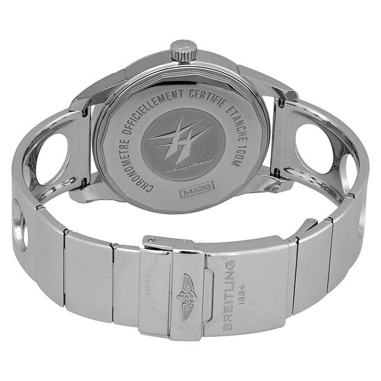 Stainless steel case with a stainless steel bracelet. Fixed stainless steel bezel. Black dial with luminous silver-tone hands and index hour markers. Minute markers around the outer rim. Dial Type: Analog. Luminescent hands and markers. Date display at the 3 o'clock position. Day of the week display centered on the 12 o'clock position. Breitling calibre 45 automatic movement with a 42-hour power reserve. Scratch resistant sapphire crystal. Pull / push crown. Solid case back. Round case shape. Case size: 43 mm. Case thickness: 12.8 mm. Band width: 22 mm. Fold over clasp with a push button release. Water resistant at 100 meters / 330 feet. Functions: date, hour, minute, second. Luxury watch style. Watch label: Swiss Made. Breitling Transocean Automatic Black Dial Men's Watch A4531012/BB69-222A.