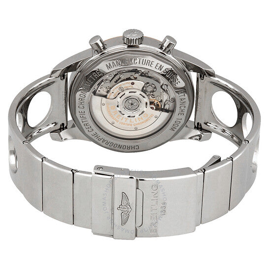 Stainless steel case with a stainless steel (air racer) bracelet. Fixed 18kt rose gold bezel. Brown dial with luminous rose gold-tone hands and index hour markers. Minute markers. Tachymeter markings around the outer rim. Dial Type: Analog. Luminescent hands and markers. Date display between the 4 and 5 o'clock positions. Chronograph - three sub-dials displaying: 60 second, 30 minute and 12 hours. Breitling calibre 01 automatic movement with a 70-hour power reserve. Scratch resistant sapphire crystal. Pull / push crown. Transparent case back. Round case shape. Case size: 43 mm. Case thickness: 14.35 mm. Band width: 20 mm. Deployment clasp with a push button release. Water resistant at 100 meters / 330 feet. Functions: chronograph, date, hour, minute, second. Luxury watch style. Watch label: Swiss Made. Breitling Transocean Chronograph Automatic Brown Dial Men's Watch UB015212/Q594-222A.