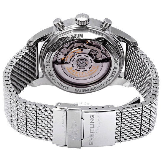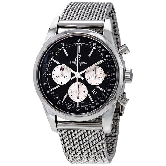 Stainless steel case with a stainless steel mesh (ocean classic) bracelet. Fixed stainless steel bezel. Black dial with luminous silver-tone hands and index hour markers. Minute markers. Tachymeter markings around the outer rim. Dial Type: Analog. Luminescent hands and markers. Date display between the 4 and 5 o'clock positions. Chronograph - three white sub-dials displaying: 60 second, 30 minute and 12 hour. Breitling calibre 01 automatic movement with a 70-hour power reserve. Scratch resistant sapphire crystal. Screw down crown. Transparent case back. Round case shape. Case size: 43 mm. Case thickness: 14.35 mm. Band width: 22 mm / 20 mm. Deployment clasp. Water resistant at 100 meters / 330 feet. Functions: chronograph, date, hour, minute, second, chronometer. Sport watch style. Watch label: Swiss Made. Breitling Transocean Chronograph Automatic Chronometer Black Dial Men's Watch AB015212/BF26/154A.