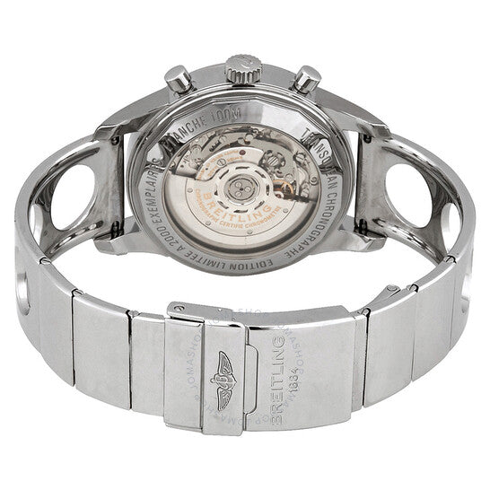 Stainless steel case with a stainless steel (air racer) bracelet. Fixed stainless steel bezel. Mercury silver dial with luminous silver-tone hands and index hour markers. Minute markers. 24 hour markers around the outer rim. Dial Type: Analog. Luminescent hands and markers. Date display between the 4 and 5 o'clock positions. Chronograph - three sub-dials displaying: 60 second, 30 minute and 12 hours. Breitling calibre 04 automatic movement with a 70-hour power reserve. Scratch resistant sapphire crystal. Pull / push crown. Transparent case back. Round case shape. Case size: 43 mm. Case thickness: 15.75 mm. Band width: 22 mm. Fold over clasp with a push button release. Water resistant at 100 meters / 330 feet. Functions: chronograph, date, hour, minute, second. Luxury watch style. Watch label: Swiss Made. Breitling Transocean Chronograph Automatic Men's Watch AB045112/G772-222A.