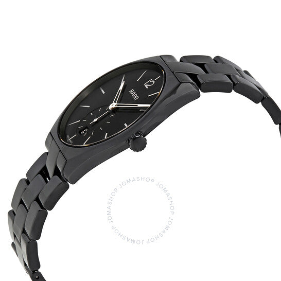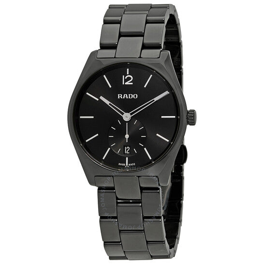 Black ceramic case with a black ceramic bracelet. Fixed black ceramic bezel. Black dial with silver-tone hands and index hour markers. Arabic numeral appears at the 12 o'clock position. Dial Type: Analog. Date display at the 6 o'clock position. Seconds subdials. Rado Calibre 239 quartz movement. Scratch resistant sapphire crystal. Pull / push crown. Solid case back. Round case shape, case size: 37 mm, case thickness: 7 mm. Band width: 20 mm, band length: 7.5 inches. Fold over with push button release clasp. Water resistant at 50 meters / 165 feet. Functions: date, hour, minute, second. Dress watch style. Watch label: Swiss Made. Rado True Specchio Black Dial Men's Watch R27081152.