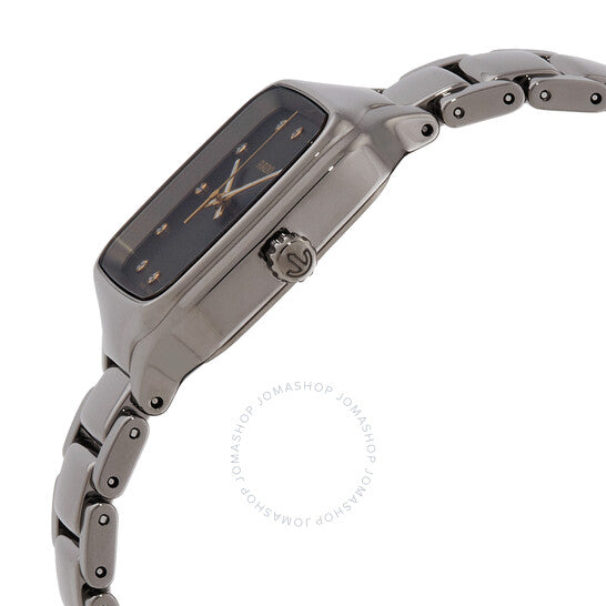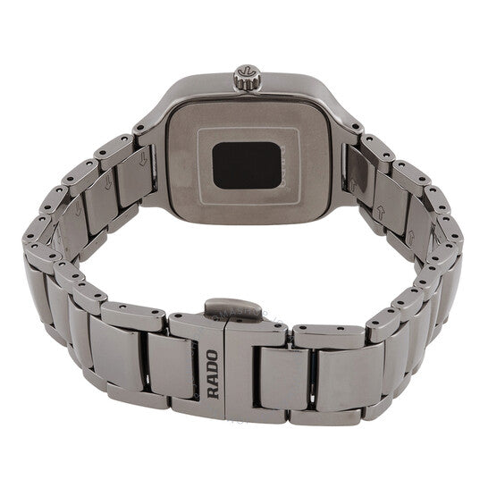 Plasma high-tech ceramic and titanium case with a plasma high-tech ceramic bracelet. Fixed plasma high-tech ceramic and titanium bezel. Grey dial with rose gold-tone hands and diamond hour markers. Dial Type: Analog. Date display at the 3 o'clock position. Quartz movement. Scratch resistant sapphire crystal. Pull / push crown. Solid case back. Square case shape, case size: 29 mm, case thickness: 8.1 mm. Butterfly clasp. Water resistant at 50 meters / 165 feet. Functions: date, hour, minute, second. True Square Series. Dress watch style. Watch label: Swiss Made. Item Variations: 01.079.6079.3.070. Rado True Square Quartz Diamond Grey Dial Ladies Watch R27079702.