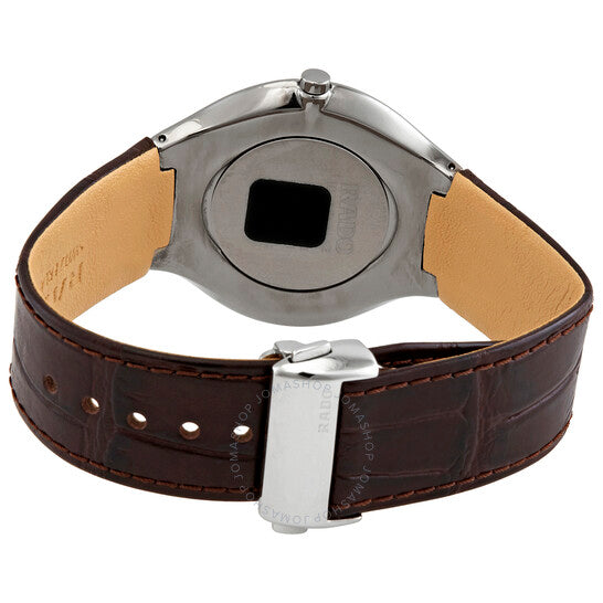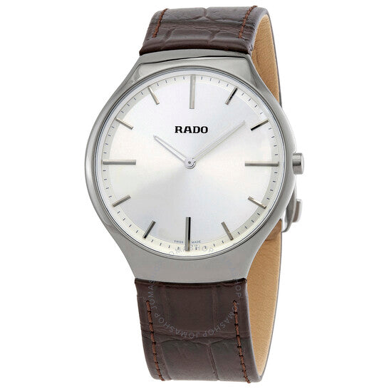 Plasma treated ceramic case with a brown leather strap. Fixed plasma treated ceramic bezel. Silver dial with silver-tone skeleton hands and index hour markers. Minute markers around the outer rim. Dial Type: Analog. Luminescent hands and markers. Rado calibre 140 quartz movement. Scratch resistant sapphire crystal. Pull / push crown. Solid case back. Round case shape. Case size: 39 mm. Case thickness: 5 mm. Band width: 20 mm. Fold over clasp with a push button release. Water resistant at 30 meters / 100 feet. Functions: hour, minute. Casual watch style. Watch label: Swiss Made. Rado True Thinline Silver Dial Brown Leather Men's Watch R27955105.