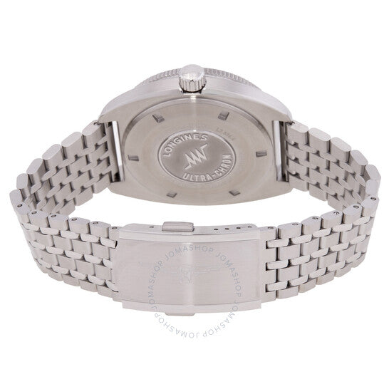 Silver-tone stainless steel case and bracelet. Uni-directional rotating black ceramic bezel. Black dial with silver-tone hands and index hour markers. Minute markers around the outer rim. Dial Type: Analog. Luminescent hands and markers. Longines Calibre L836 hand wind movement. Scratch resistant sapphire crystal. Screw down crown. Round case shape, case size: 43 mm. Deployment with push button release clasp. Water resistant at 300 meters / 1000 feet. Functions: date, hour, minute, second. Additional Info: original box, international warranty card, manual (complete accessories). Ultra- Chron Series. Luxury watch style. Watch label: Swiss Made. Longines Ultra- Chron Hand Wind Black Dial Men's Watch L2.836.4.52.9.