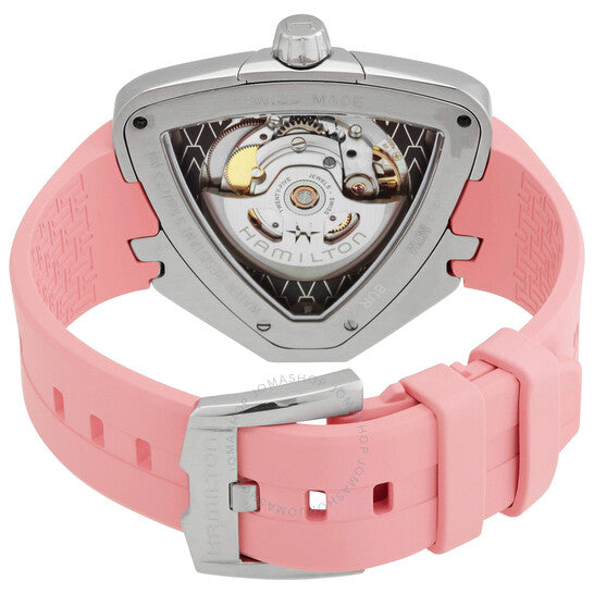 Silver-tone stainless steel case with a pink rubber strap. Fixed silver-tone stainless steel bezel. White dial with luminous silver-tone dauphine-style shape hands and index hour markers. Minute markers around the outer rim. Dial Type: Analog. Luminescent hands and markers. Date display at the 3 o'clock position. Hamilton Calibre H-10 Automatic movement, based upon ETA C07.111, containing 25 Jewels, bitting at 21600 vph, and has a power reserve of approximately 80 hours. Scratch resistant sapphire crystal. Transparent see through case back. Asymmetric case shape, case size: 42.5 mm x 44.6 mm. Tang clasp. Water resistant at 50 meters / 165 feet. Functions: date, hour, minute, second. Ventura Elvis80 Series. Dress watch style. Watch label: Swiss Made. Hamilton Ventura Elvis80 Automatic White Dial Men's Watch H24505011.
