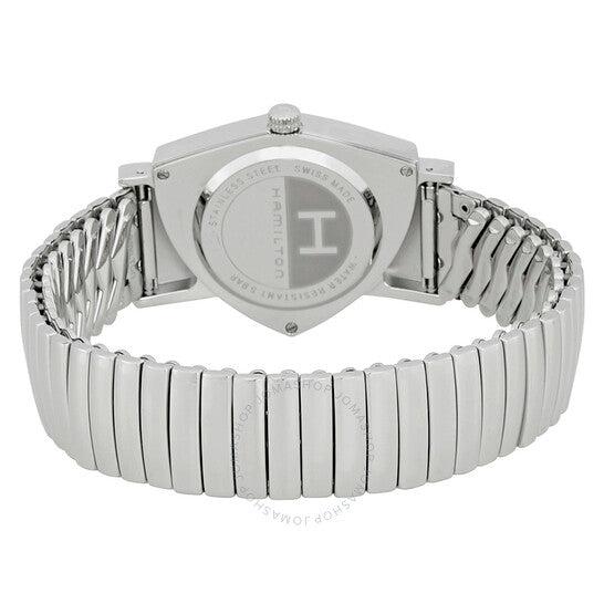 Stainless steel case with a stainless steel expansion bracelet. Fixed stainless steel bezel. Black dial with silver-tone dauphine-style shape hands and index hour markers. Dial Type: Analog. ETA caliber F05.111 quartz movement. Scratch resistant mineral crystal. Pull / push crown. Solid case back. Asymmetric case shape. Case dimensions: 50.3 mm x 32.3 mm. Case thickness: 9.27 mm. Band width: 17 mm. Water resistant at 50 meters / 165 feet. Functions: hour, minute, second. Ventura L Series. Dress watch style. Watch label: Swiss Movt. Hamilton Ventura L Black Dial Asymmetric Men's Watch H24411232.