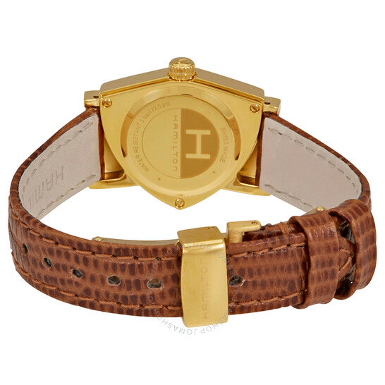 Yellow gold-tone stainless steel case with a brown (calfskin) leather strap. Fixed yellow gold-tone bezel. White dial with yellow gold-tone dauphine-style hands and index hour markers. Dial Type: Analog. ETA caliber F03.101 quartz movement. Scratch resistant mineral crystal. Pull / push crown. Solid case back. Asymmetric case shape. Case size: 25 mm. Case thickness: 7 mm. Strap width: 12 mm. Tang clasp. Water resistant at 50 meters / 165 feet. Functions: hour, minute, second. Casual watch style. Watch label: Swiss Made. Hamilton Ventura White Dial Shield Shaped Ladies Watch H24101511.