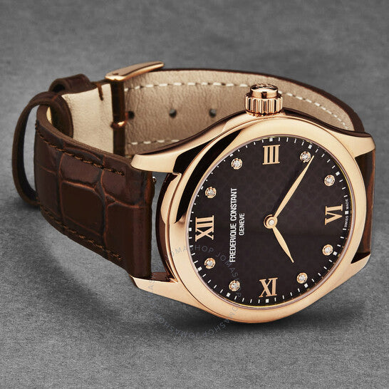 18kt rose gold case with a brown calf leather strap. Fixed bezel. Chocolate dial with rose gold hands and Roman- diamond numeral hour markers. Dial Type: Analog-digital. Frederique Constant Calibre FC-286 quartz movement. Scratch resistant sapphire crystal. Solid case back. Round case shape, case size: 36 mm. Water resistant at 50 meters / 165 feet. Functions: hour, minute, alarm, heart rate monitor. Vitality Series. Sport watch style. Watch label: Swiss Made. Frederique Constant Vitality Quartz Analog-Digital Diamond Ladies Smart Watch FC-286CD3B4.