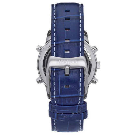 Band Color: Blue Stainless Steel; Band Width: 21mm near case; 20mm near clasp/buckle; Bezel Color: Silver; Case: Silver + Circle-Shaped; Case Finish: Polished + Stainless Steel; Case Thickness: 15mm; Case Width: 42mm; 45mm with Crown; Clasp / Buckle: Fold Over Push Button Deployment; Dial: Silver + Analog; Hand Color: Silver; Movement: Chinese + Automatic; Time Zones: Single; Water Resistance: 10 ATM.