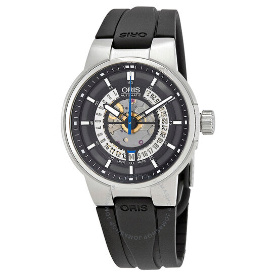 Stainless steel case with a black rubber strap. Fixed stainless steel bezel. Skeleton dial with luminous black hands and index hour markers. Minute markers around the outer rim. Dial Type: Analog. Luminescent hands and markers. Date display at the 6 o'clock position. Oris calibre 733 automatic movement with a 38-hour power reserve. Scratch resistant sapphire crystal. Screw down crown. Transparent case back. Round case shape. Case size: 42 mm. Band width: 24 mm. Fold over clasp with a safety release. Water resistant at 100 meters / 330 feet. Functions: date, hour, minute, second. Dress watch style. Watch label: Swiss Made. Oris Williams Automatic Skeleton Dial Men's Watch 01 733 7740 4154-07 4 24 54FC.