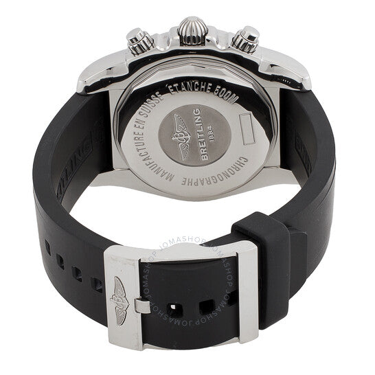 Steel case with a diver pro ii bracelet. Unidirectional ratcheted steel bezel. Blue dial with luminous hands and stick hour markers. Minute markers. Tachymeter scale around the outer rim. Luminescent hands and markers. Date displays at the 3 o'clock position. Chronograph - three sub-dials displaying: 1/4th second, 30 minutes and 12 hours. Self winding mechanical movement. Scratch resistant sapphire crystal. Screw locked crown with two gaskets. Solid case back. Case diameter: 43.70 mm. Case thickness: 17.10 mm. Deployment clasp. Water resistant at 300 meters/ 1000 feet. Functions: hours, minutes, seconds, date, chronograph, tachymeter. Breitling Chronomat Men's Blue Dial Chronograph Watch AB011011-C789BKPD
