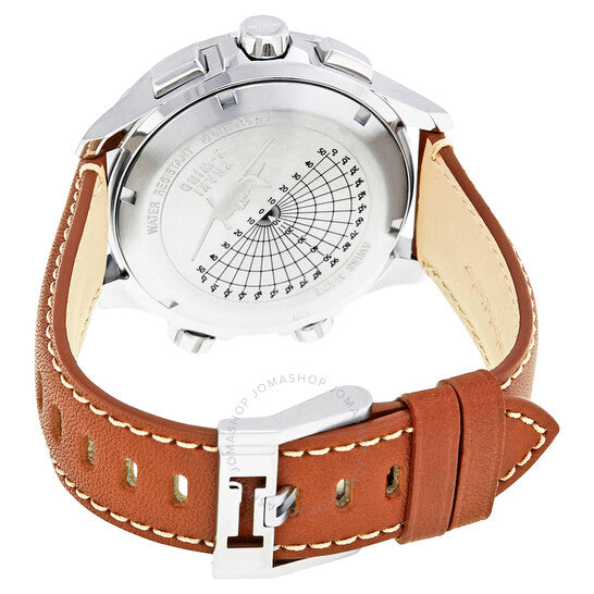 Stainless steel case with a brown leather strap. Uni-directional rotating stainless steel bezel. Black dial with luminous silver-tone hands and Arabic numeral hour markers. Minute markers. Cross wind markers around the outer rim. Dial Type: Analog. Luminescent hands and markers. Date display at the 3 o'clock position. Three sub-dials displaying:- 60 second, 24 hour and 12 hour. Hamilton calibre G10.962 quartz movement. Scratch resistant sapphire crystal. Screw down crown. Solid case back. Case size: 46 mm. Case thickness: 14 mm. Round case shape. Band width: 22 mm. Tang clasp. Water resistant at 100 meters / 330 feet. Functions: chronograph, x wind, date, hour, minute, second. Casual watch style. Watch label: Swiss Made. Hamilton X-Wind Chronograph Black Dial Men's Watch H77912535.