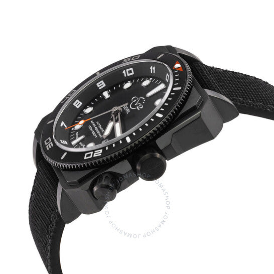 Black stainless steel case with a black canvas strap. Uni-directional rotating black stainless steel bezel. Black dial with silver-tone hands and index hour markers. Minute markers around the outer rim. Dial Type: Analog. Luminescent hands and markers. Date display between 4 and 5 o'clock position. Sellita Caliber SW200 Automatic movement, containing 26 Jewels, bitting at 28800 vph, and has a power reserve of approximately 38 hours. Scratch resistant sapphire crystal. Screw down crown. Transparent see through case back. Square case shape, case size: 44 mm, case thickness: 13 mm. Band width: 22 mm. Buckle clasp. Water resistant at 100 meters / 330 feet. Functions: date, hour, minute, second. Xo Submarine Series. Luxury watch style. Watch label: Swiss Made. GV2 by Gevril XO Submarine Automatic Black Dial Men's Watch 4546.