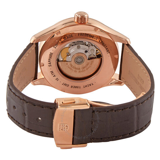 Rose gold-tone stainless steel case with a dark brown (alligator) leather strap. Fixed rose gold-tone bezel. Silver dial with luminous rose gold-tone hands and index hour markers. 24 hour markers. Minute markers around the outer rim. Dial Type: Analog. Luminescent hands. Date display at the 3 o'clock position. Frederique Constant calibre FC-350 automatic movement, based upon Sellita SW200, containing 26 Jewels, bitting at 28800 vph, and has a power reserve of approximately 38 hours. Scratch resistant convex sapphire crystal crystal. Transparent case back. Round case shape. Case size: 42 mm. Case thickness: 12 mm. Fold over clasp with a push button release. Water resistant at 100 meters / 330 feet. Functions: GMT, second time zone, hour, minute, second. Sport watch style. Watch label: Swiss Made. Frederique Constant Yacht Timer GMT Automatic Silver Dial Men's Watch FC-350VT4H4.